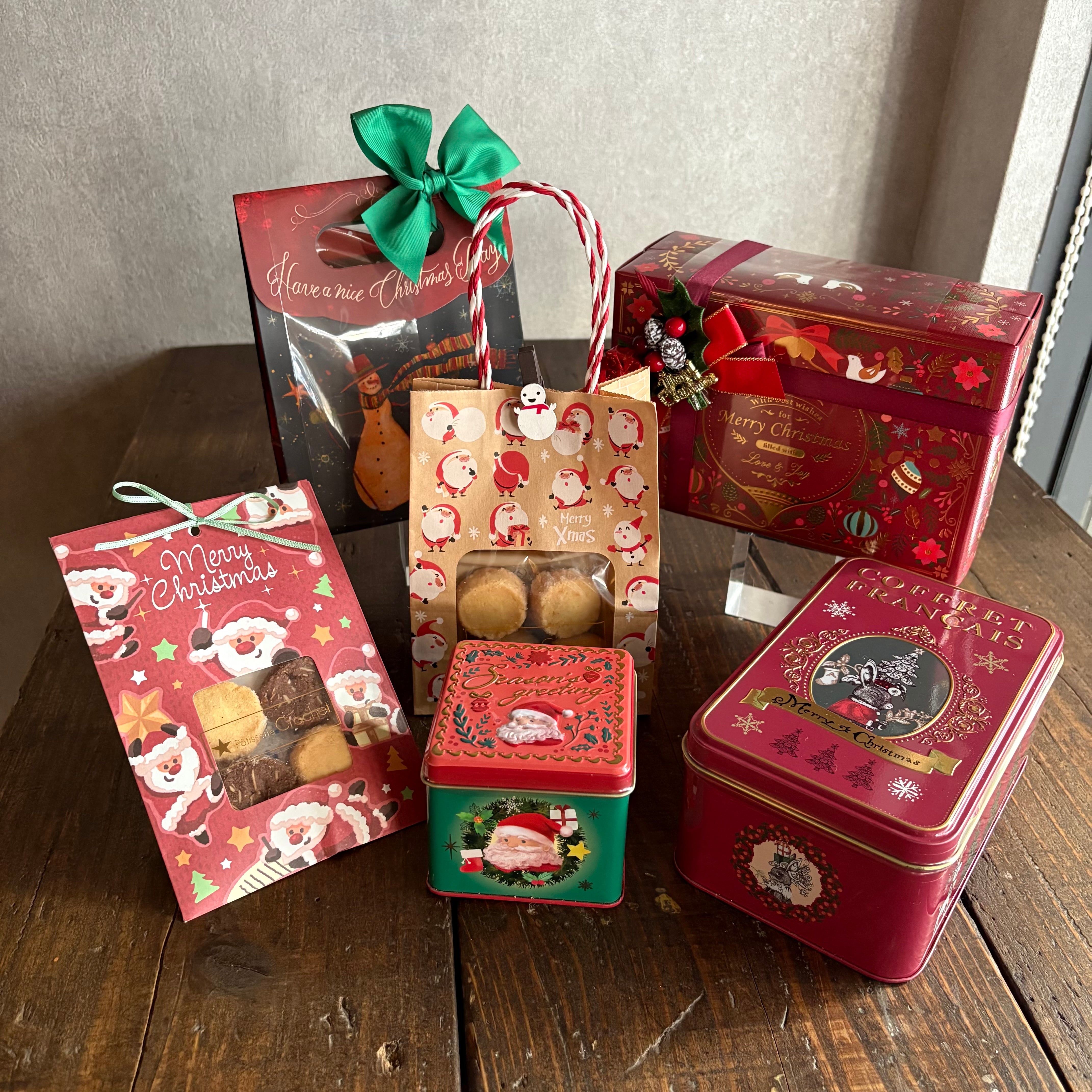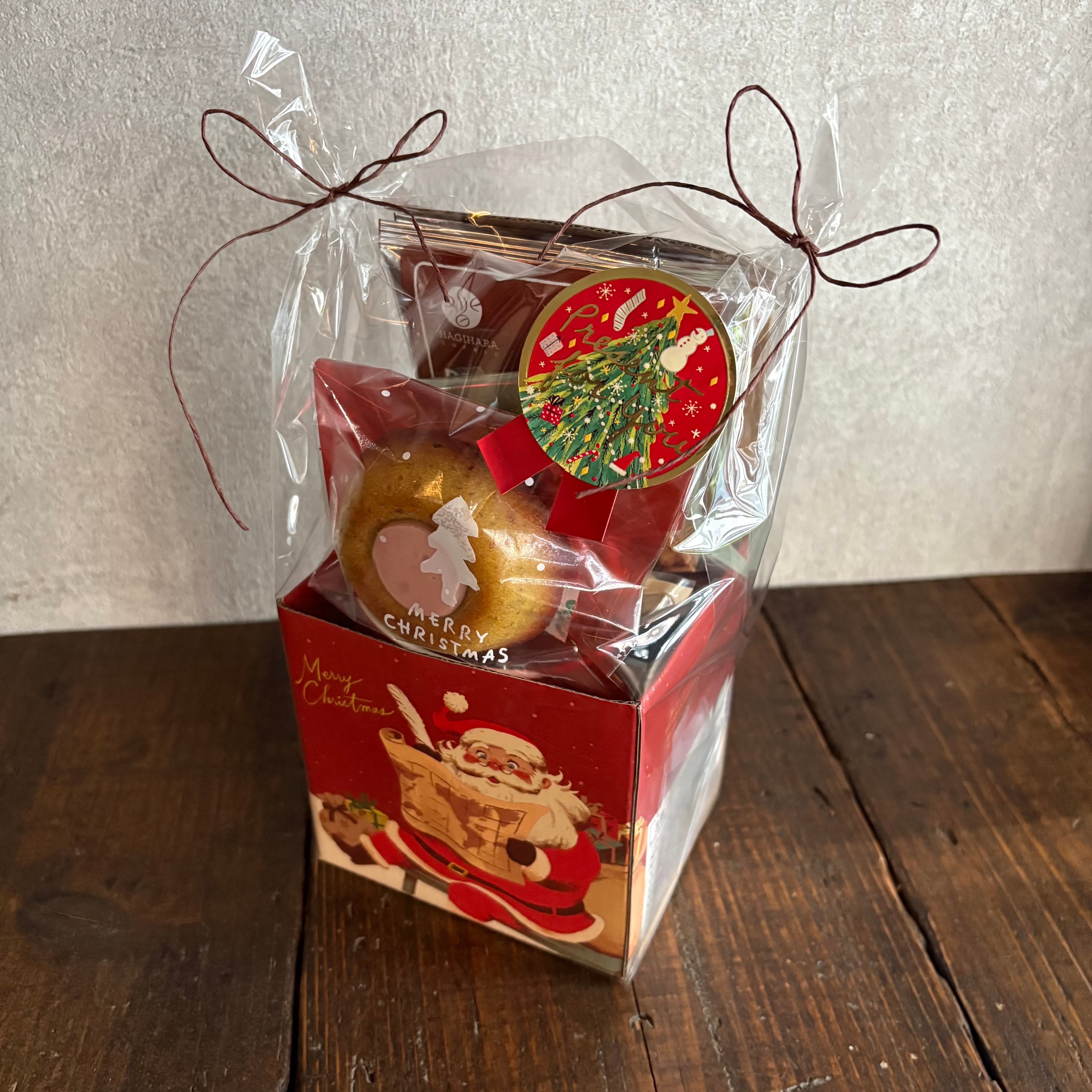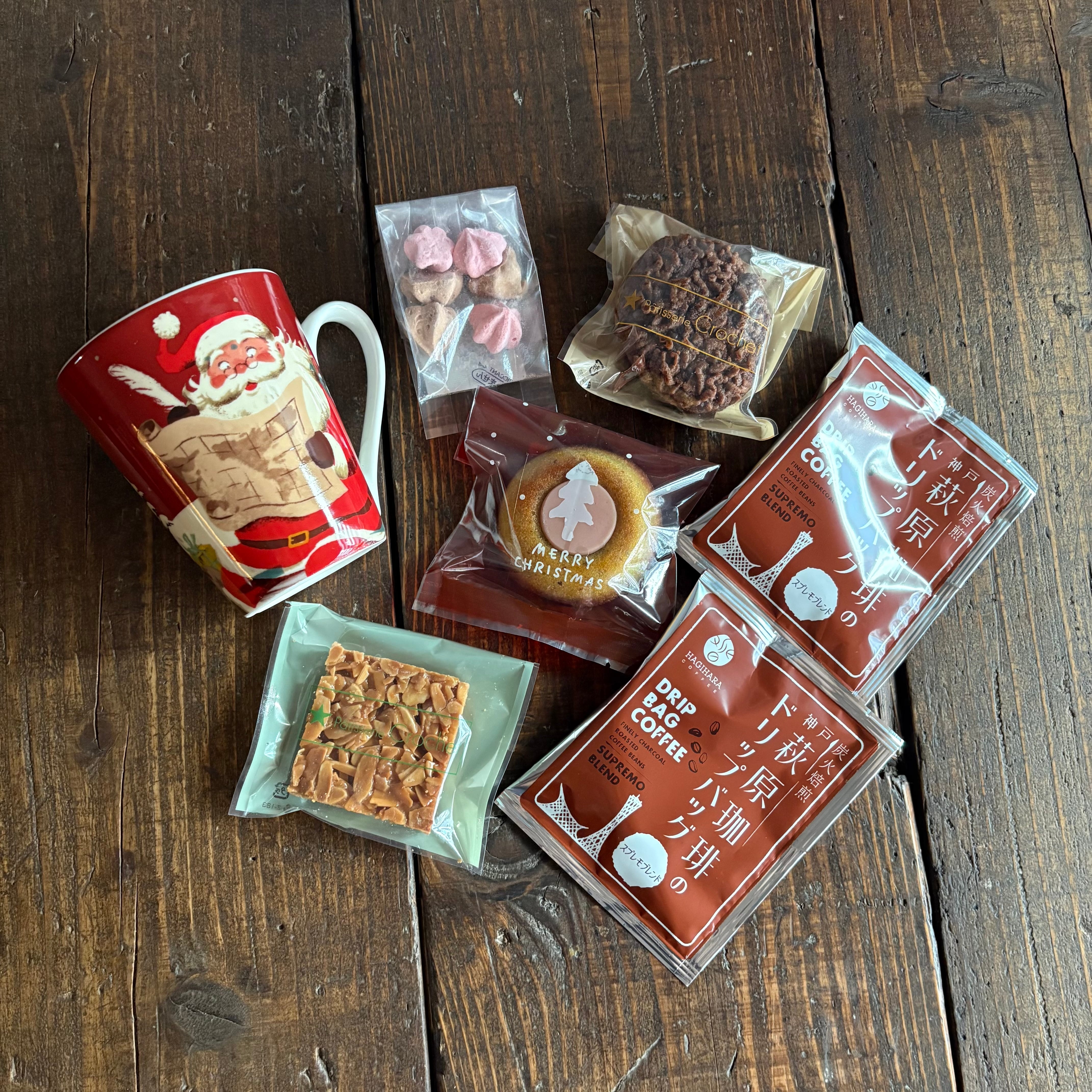 サンタクロースのマグカップにドリップコーヒー2個、いちごとピスタチオのティグレ、ブラウニー、フロランタンオランジュ、いちごとショコラのメレンゲが入った6個入りのセットです